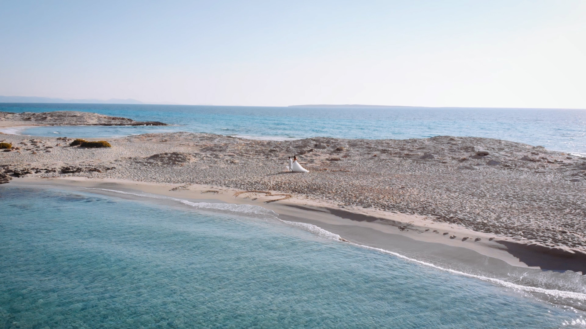 La cerimonia, a piedi nudi sulla sabbia dorata di Es Pujols, è stata una promessa sussurrata alla brezza marina. E mentre le loro parole volavano, il nostro sguardo si è alzato in volo, catturando con il drone la vastità di quel momento, un punto d'amore nell'immensità cristallina dell'isola.